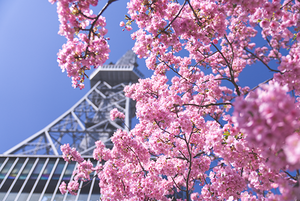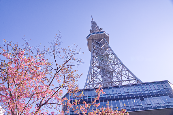 名古屋のシンボル「中部電力ミライタワー」南側、レイヤード久屋大通公園の桜もまさに今が満開。晴れた日の青空には、ピンク色の花びらがひときわ映えます。